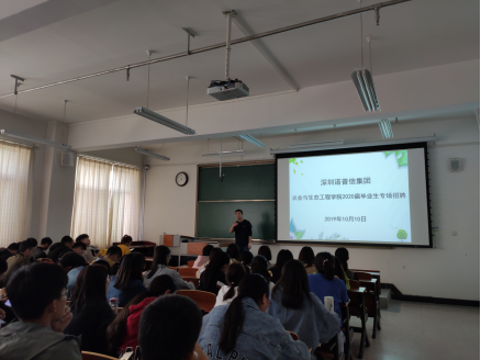 2019年10月10日下午,深圳诺普信农化股份有限公司在公司进行了2020届毕业生专场招聘宣讲会,招聘涉及农学、园艺、种子科学与工程等涉农专业。招聘会期间,企业负责人面向员工进行了招聘宣讲,员工针对工作岗位、薪资待遇等问题与负责人进行了沟通交流。经过宣讲,公司多名员工会后与企业负责人进行了深入交流,并达成初步意向。